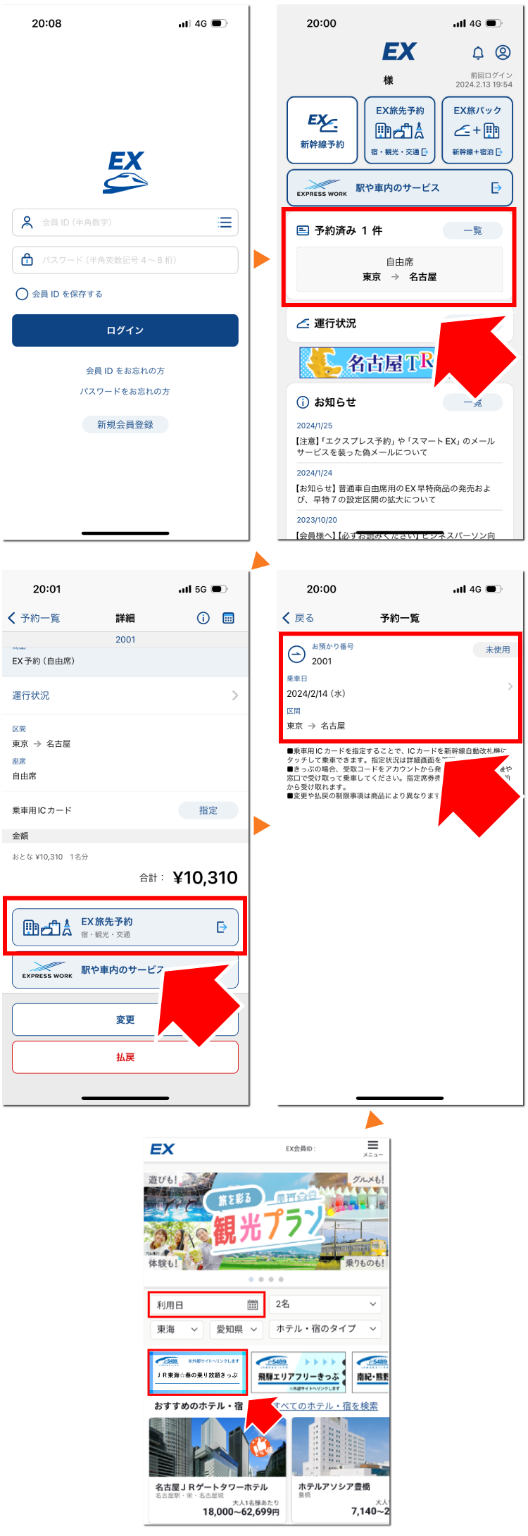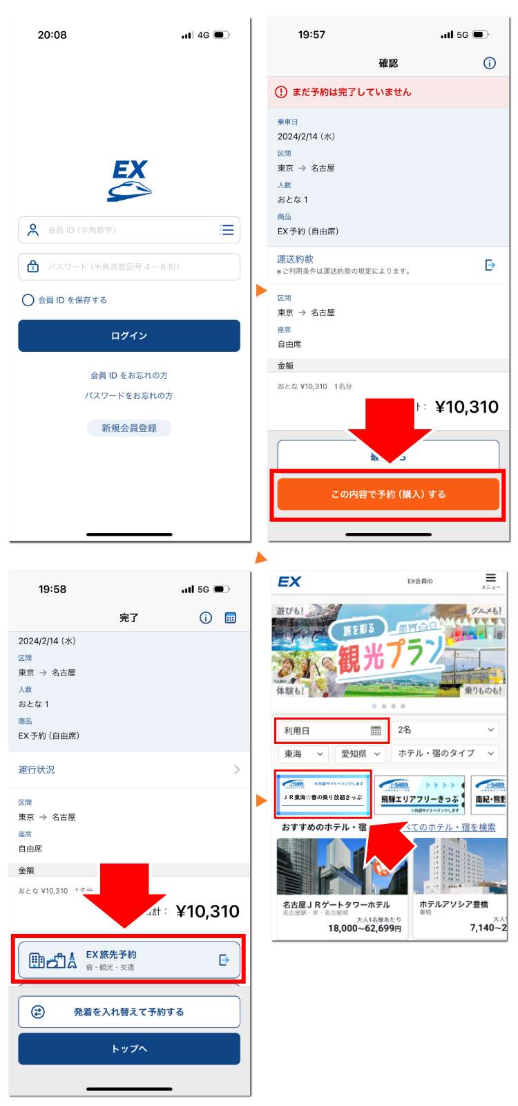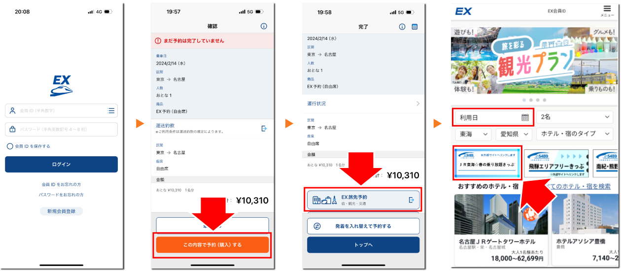 - 「EXサービス」で熱海~米原間の駅を着駅とする新幹線をご予約後、「EXサービス」にログイン後のリンク(「EX旅先予約」)から「e5489」をご利用いただく場合に限ります(「e5489」での予約には、WESTER会員登録(無料)が必要です)。