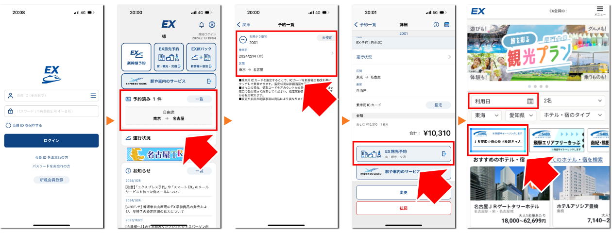 着駅が熱海~米原駅となる新幹線の切符を購入していただき、EX旅先予約の画面にて本きっぷの利用期間内の日付を選択すると、「JR東海☆春の乗り放題きっぷ」のバナーが表示されます。